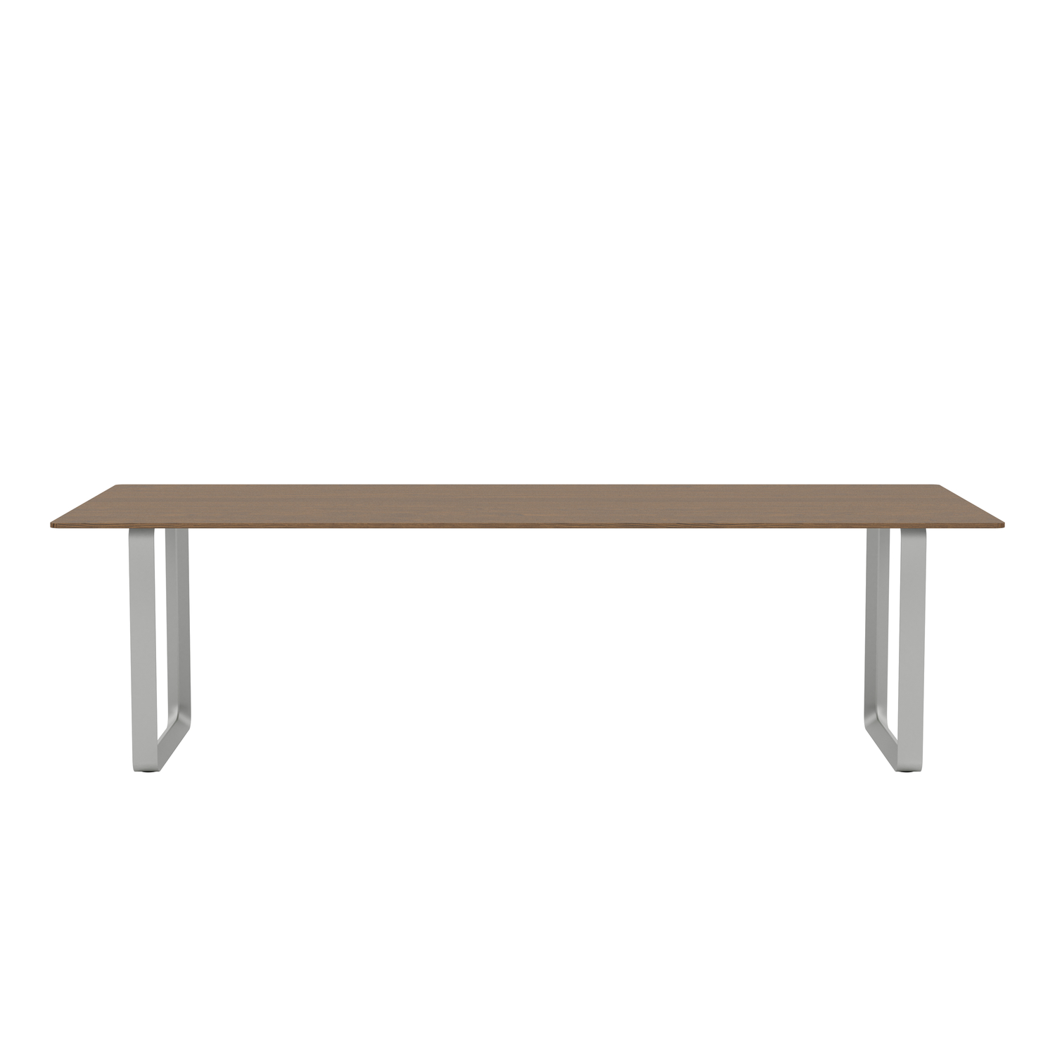 Tabletop in plywood with lacquered oak veneer surface, Black and Grey version in plywood with linoleum surface, White version in plywood with laminate surface (HPL). Solid Oak and Solid Smoked Oak tabletop in FSC™-certified (FSC-C028824) oak. Frame in powder-coated aluminum.