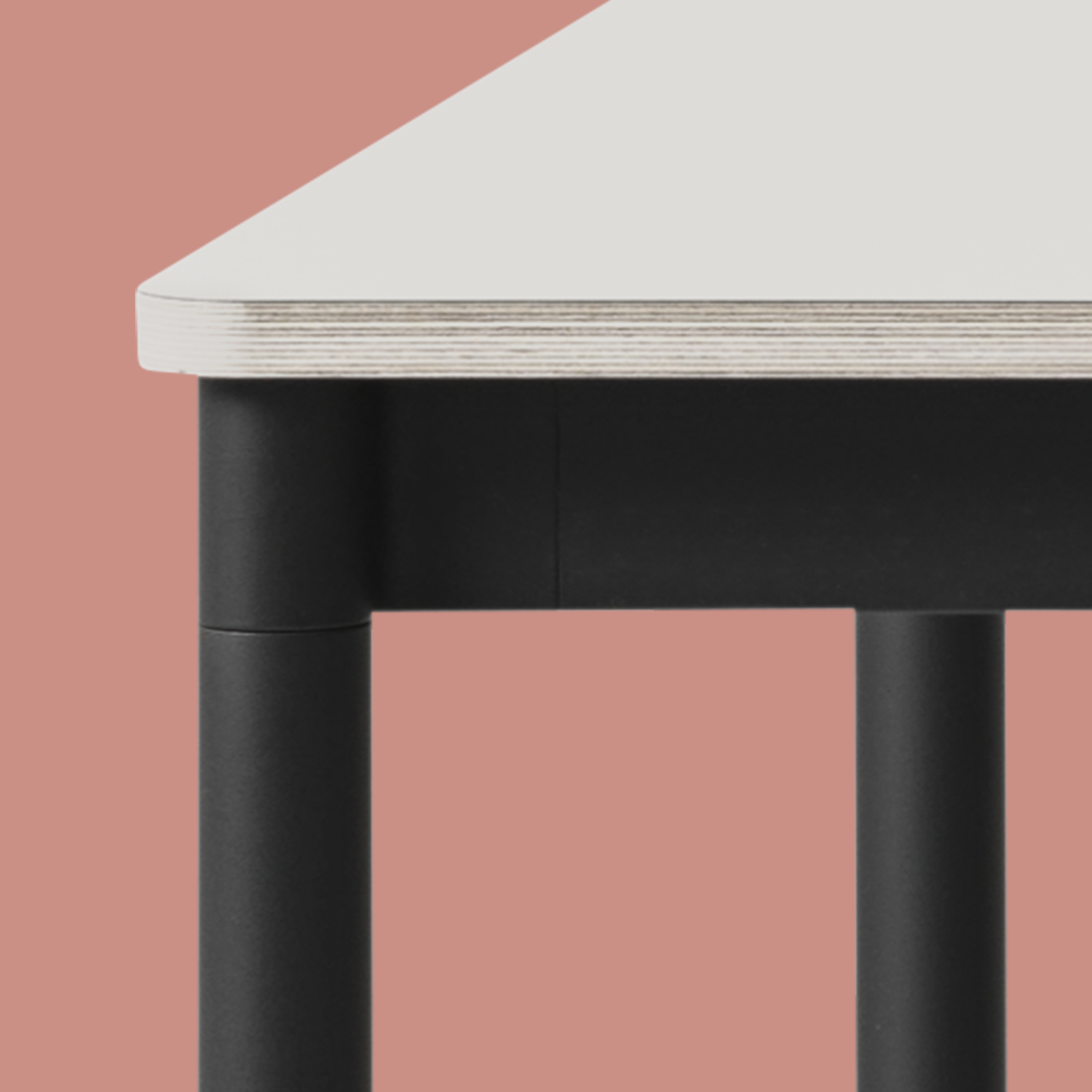 The tabletop is made of plywood with either laminate, linoleum, or oak veneer surface and a water-based lacquer. Plywood or ABS edges. Frame and legs in powder-coated aluminum.