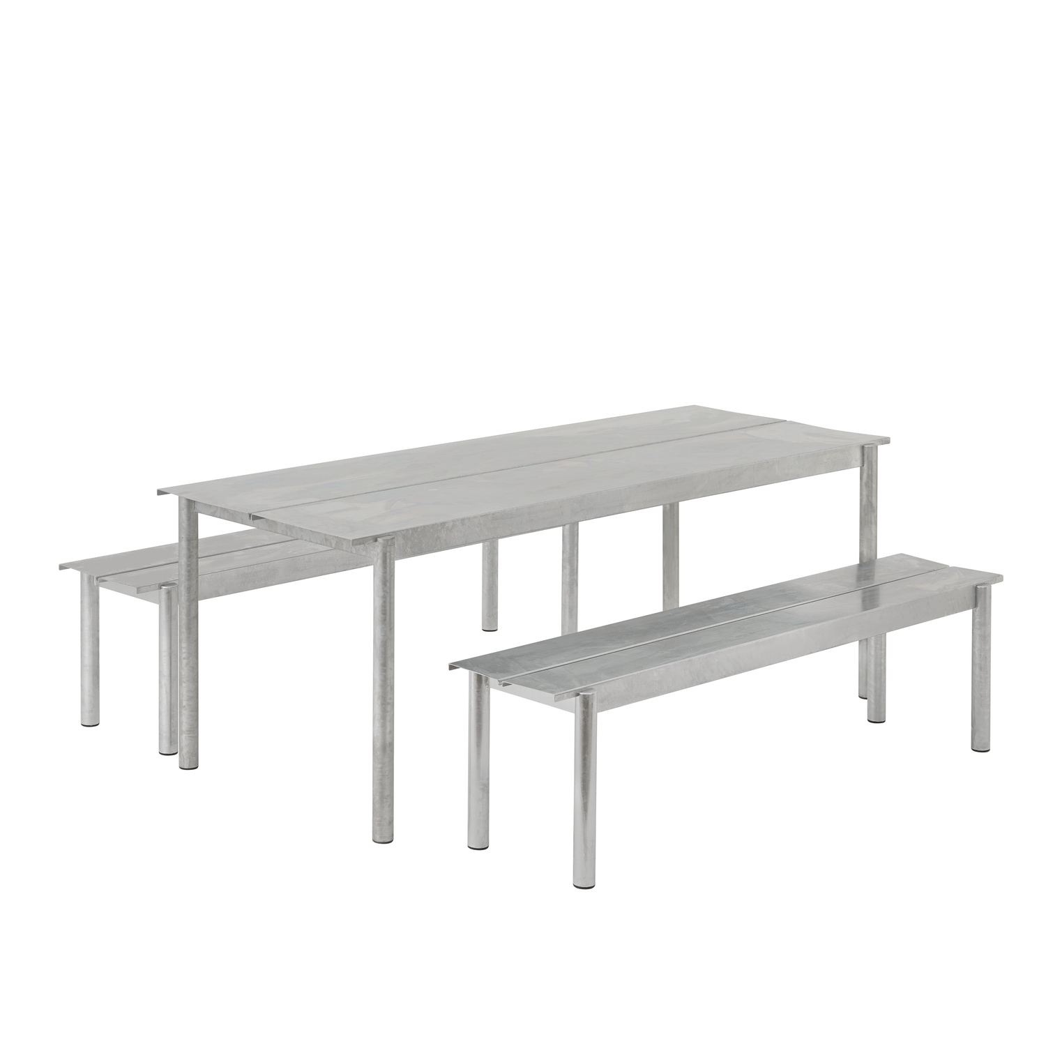 The Linear Steel Bench brings new perspectives to modern outdoor furniture through its straight lines alongside the folded edges, halfcircular intersecting legs and small spacing for easy removal of water. Kept visually clean for long-lasting aesthetics, the Linear Steel Bench finds its distinct character through subtle detailing and a simple expression, allowing for it to complement any outdoor setting. The Linear Steel Bench is designed in proportions that allow for it to slide easily under the matching Linear Steel Table.