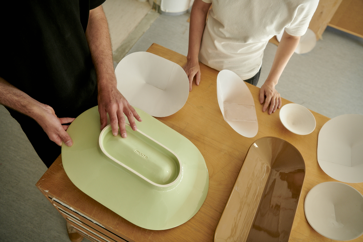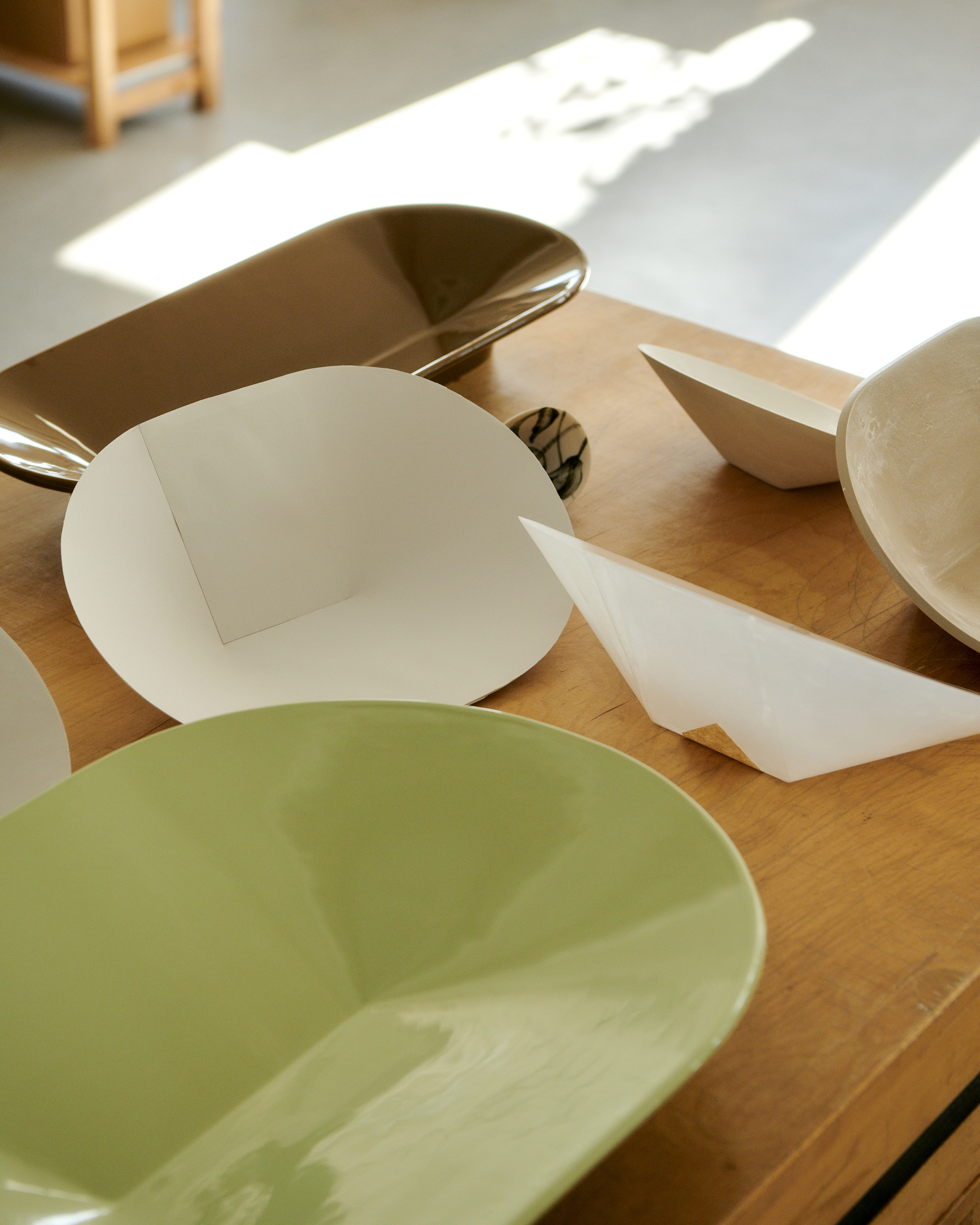 The Mere Bowl is a sculptural centerpiece, one that looks beautiful in a tablescape or space whether it is in use or not. Its characteristic shape is simple yet ingenious, as a line down its middle folds out to the sides forming a bowl. Elevated by a discrete foot, it looks as if floating. Manufactured in tactile ceramic stoneware, it has been coated in a high-gloss glaze that enhances the shadows that form along Mere Bowl’s fold. This surface treatment makes the bowl food safe.