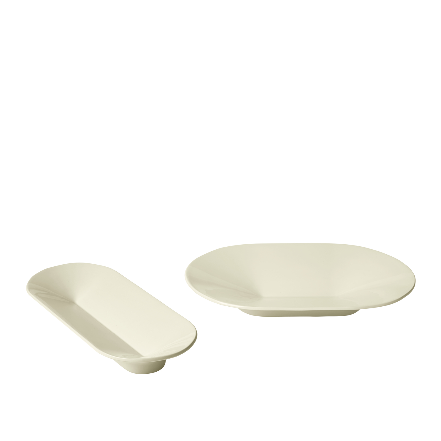The Mere Bowl is a sculptural centerpiece, one that looks beautiful in a tablescape or space whether it is in use or not. Its characteristic shape is simple yet ingenious, as a line down its middle folds out to the sides forming a bowl. Elevated by a discrete foot, it looks as if floating. Manufactured in tactile ceramic stoneware, it has been coated in a high-gloss glaze that enhances the shadows that form along Mere Bowl’s fold. This surface treatment makes the bowl food safe.