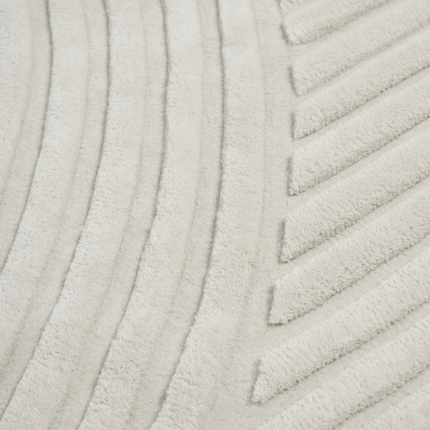 Relevo is a soft rug with a distinctly sculptural quality. Its striking graphic pattern is produced by trimming the tufted wool in different levels, thereby creating an eye-catching shadowplay that gives a sense of being two-tone rather than monochrome. The rug’s single rounded corner gives it a unique character, a dynamic expression in any setting.