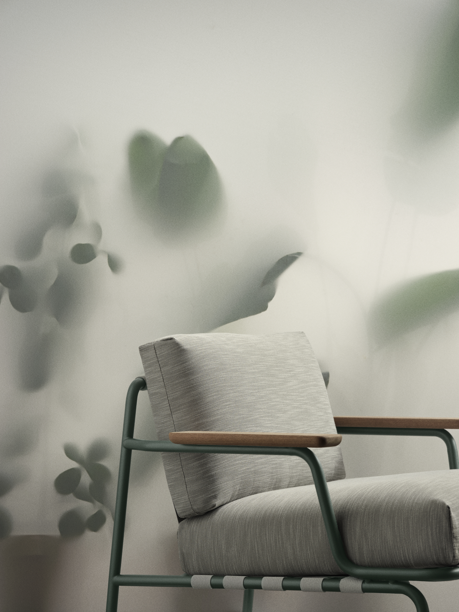 Settle Outdoor Lounge Chair w. Armrest invites you to settle into its comfort, providing an ideal setting for enjoying the outdoors all day. Its airy steel frame, complete with visible belts and intricate details, enhances its visual allure from all angles, while its armrests, made from FSC™-certified (FSC-C028824) sapele mahogany wood, add a warm, tactile feel. Settle’s steel frame is galvanized, primed and powder-coated, ensuring corrosion resistance for long-lasting use. The plush cushions, made with quick-dry foam and durable outdoor textiles, offer fast-drying resilience in rain showers and year-round durability when used with an outdoor cover.