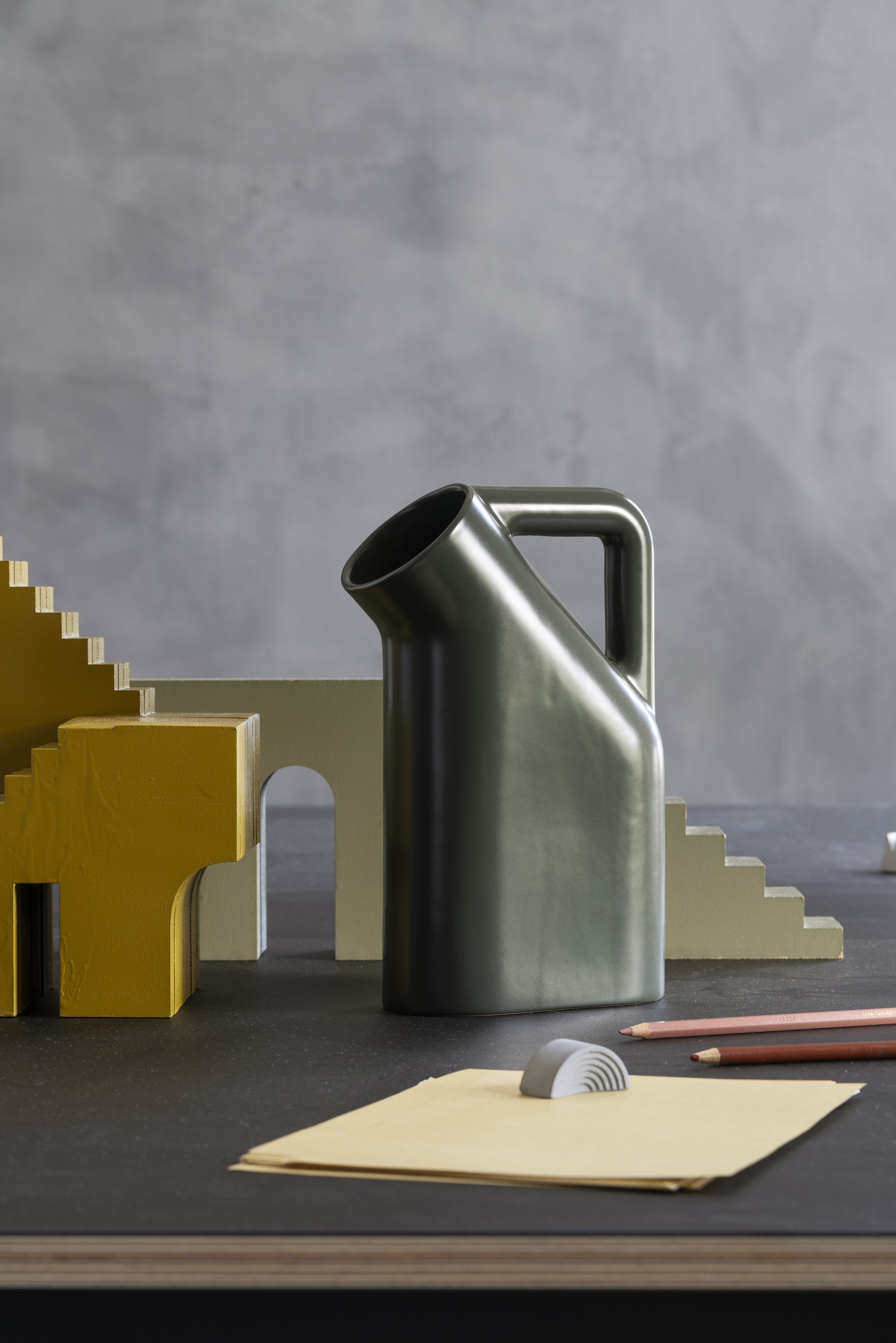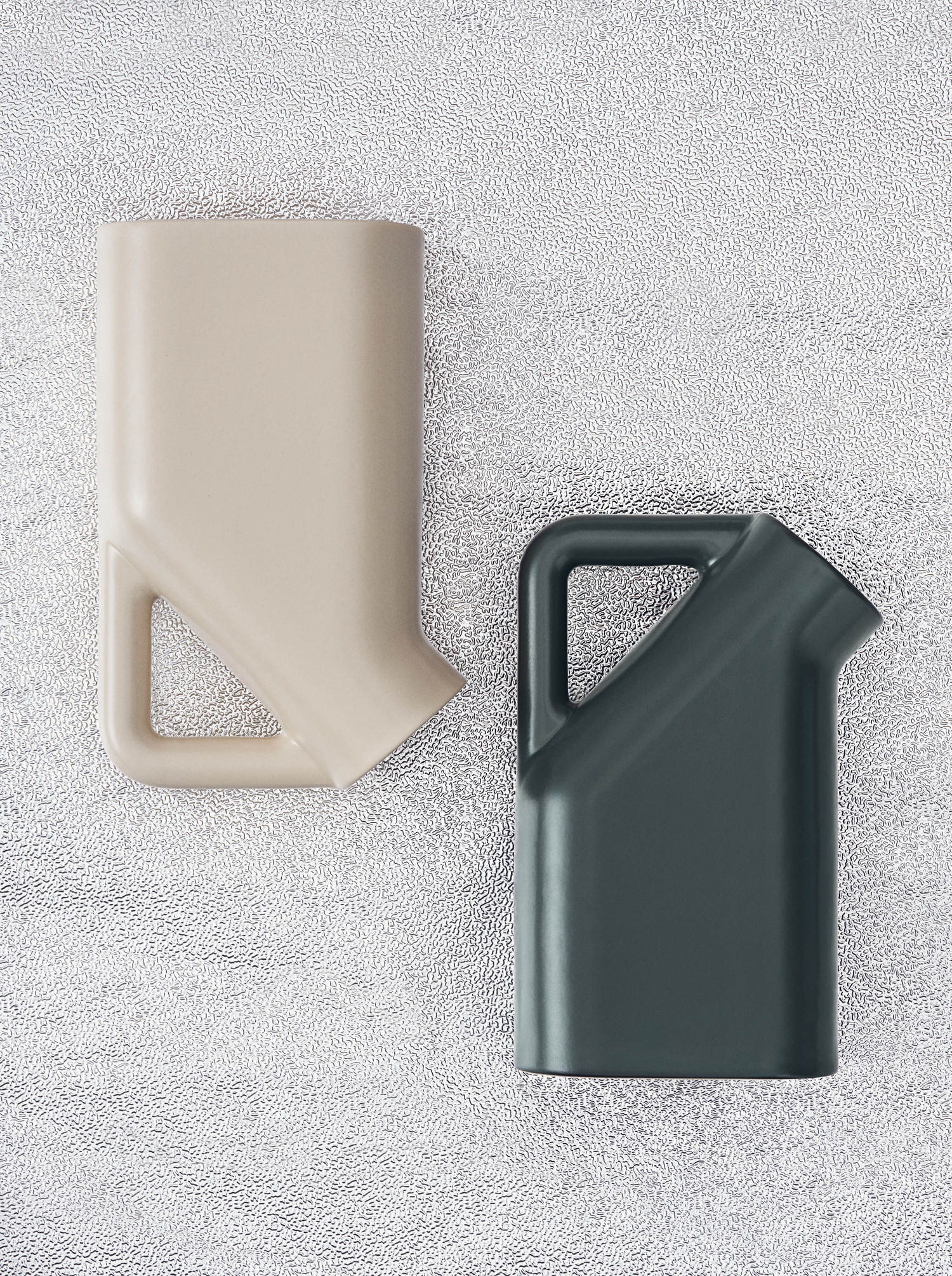 The Tub Jug is an industrial carafe with a contemporary expression, echoed through its angled handle and wide opening that bring both function and character to the design. The design is made in glazed ceramics.