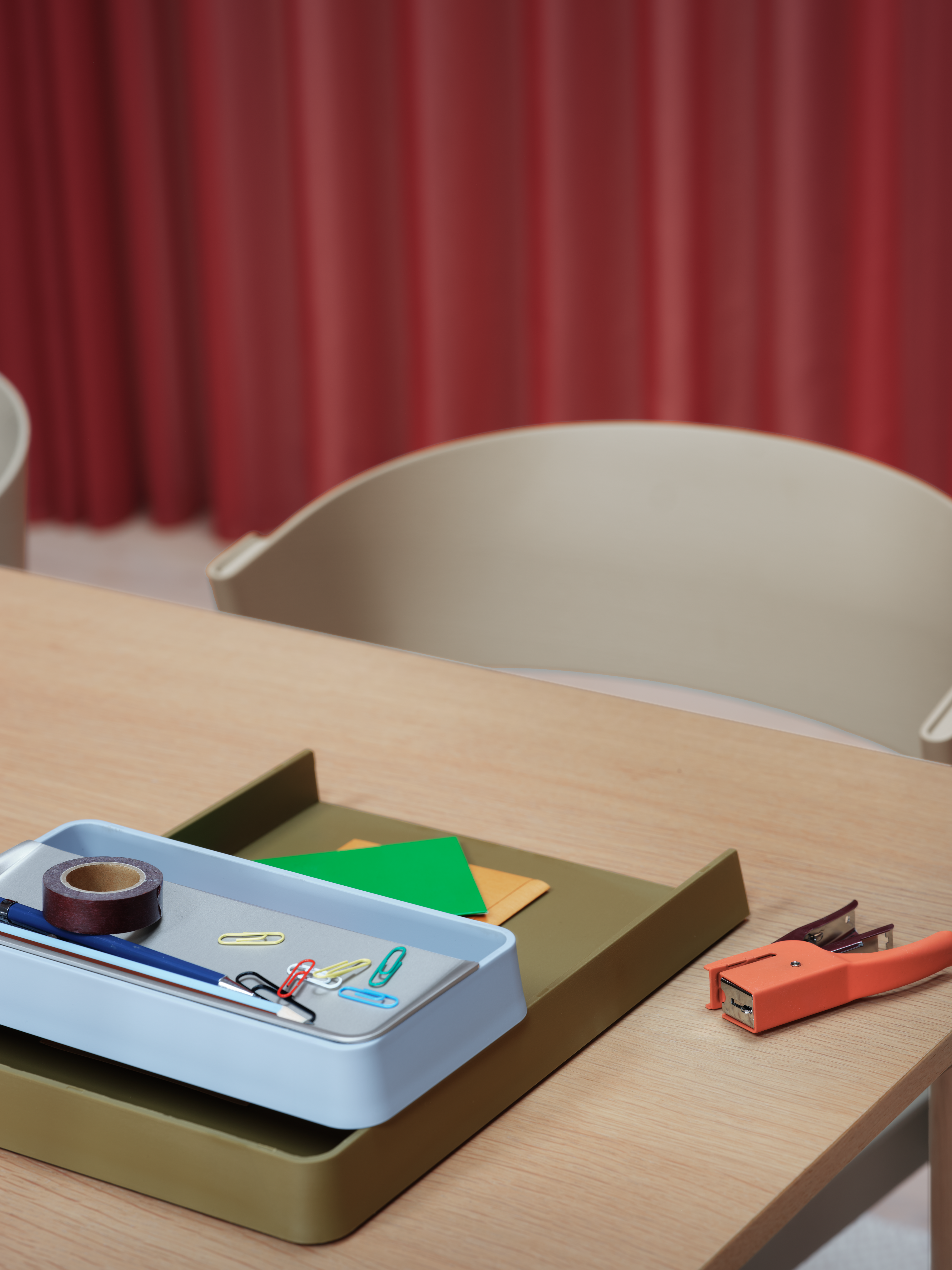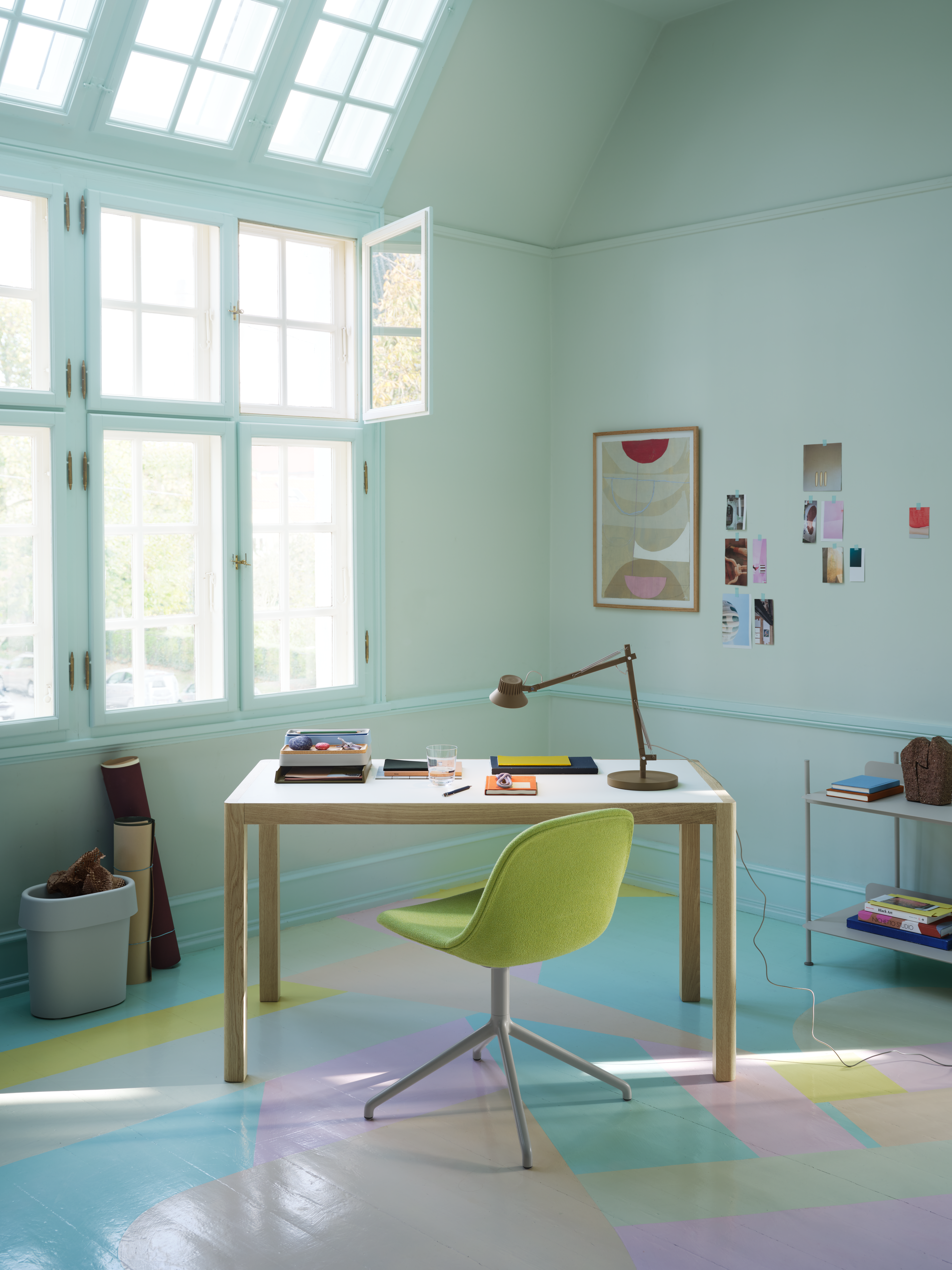• Workspace setting featuring the Leaf Table Lamp in dark green, Silent Vase 11 cm in clear glass, and the Workshop Table with black linoleum top. A minimal composition with refined, functional design.