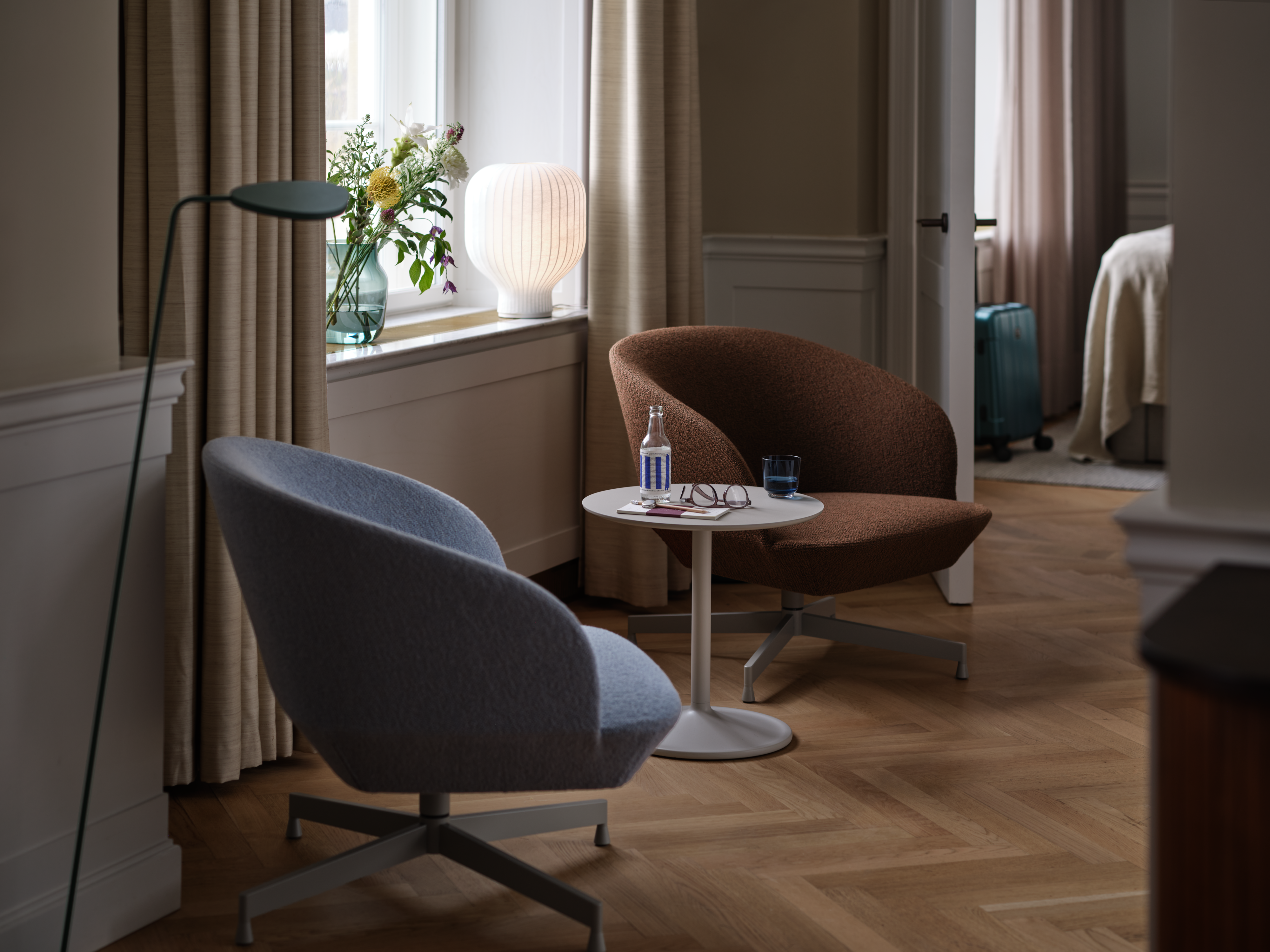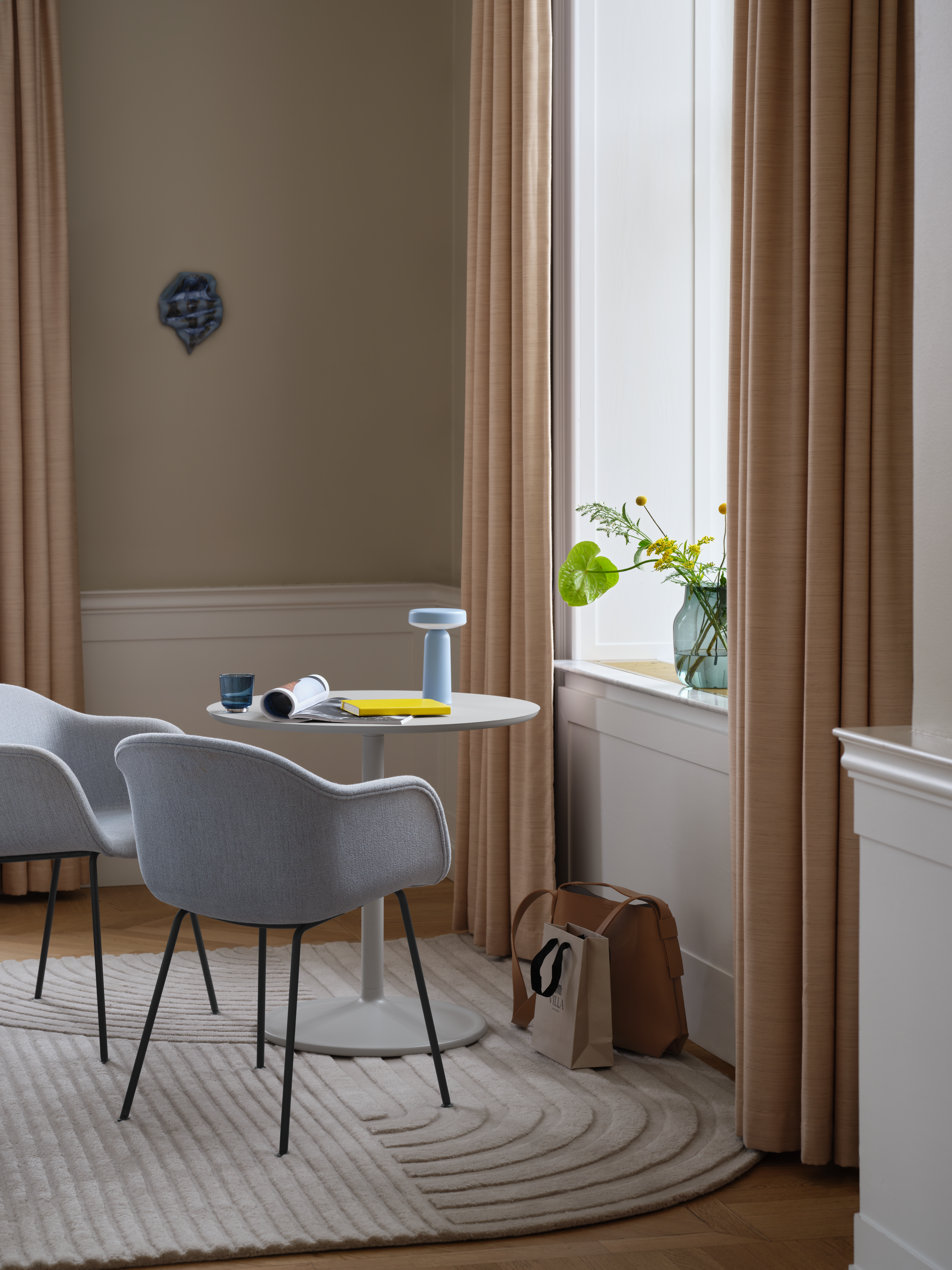 • Interior setting featuring the Wrap Lounge Chair in Hearth 008, Leaf Floor Lamp in dark green, Relevo Rug in off-white, and Kink Vase in light blue.