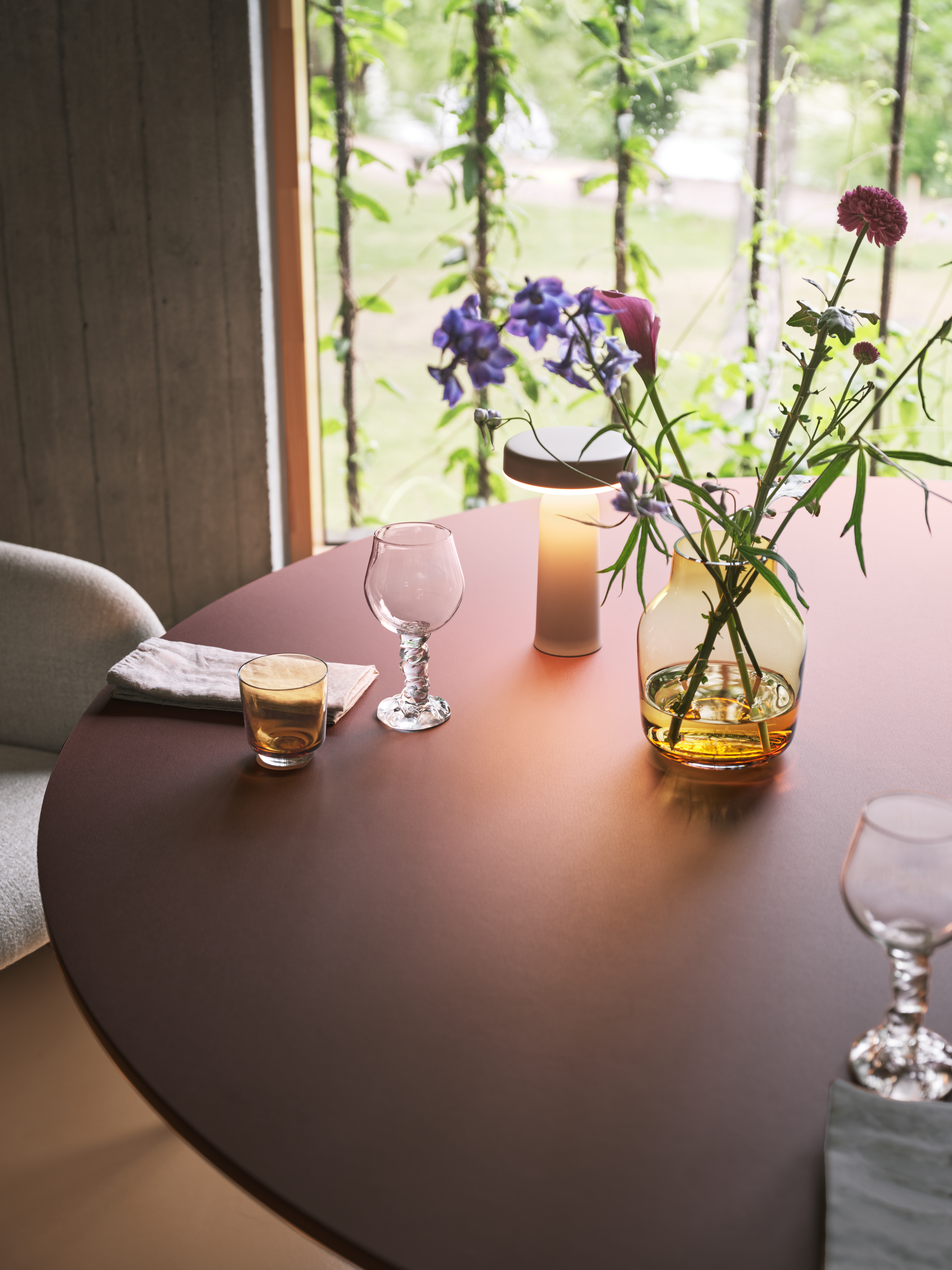 • A Connect table in Oak Veneer placed in the sunlight and styled with a Kink Vase in light blue with orange and yellow flowers.